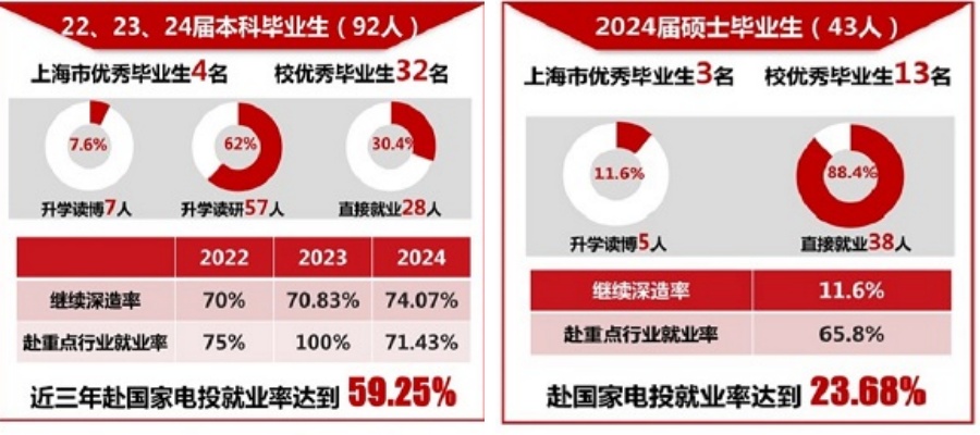 就业数据显实力。2022-2024届本科毕业生共计92人,继续深造64人,直接就业28人。继续深造率逐年递增,达74.07%,毕业生100%就业,直接就业28人中,近三年赴国家电投就业率为59.25%。