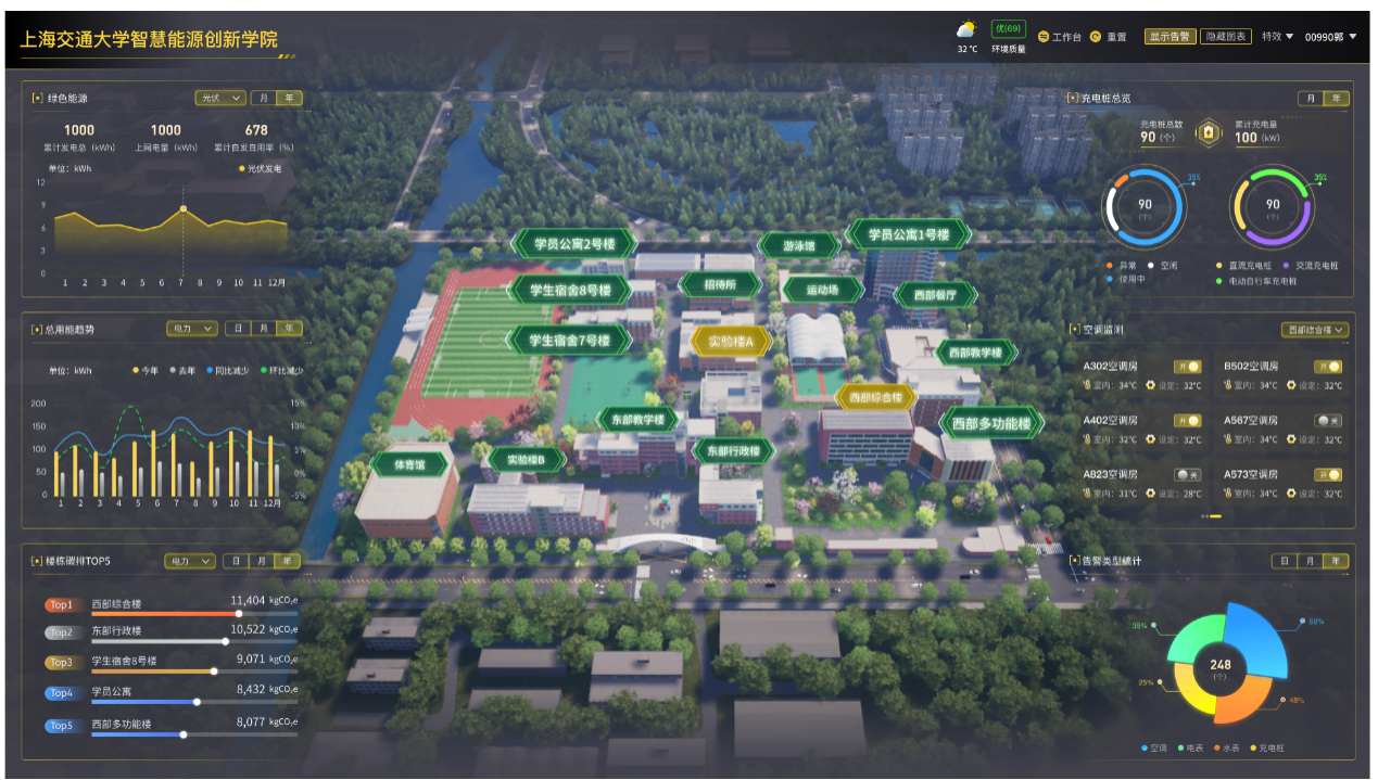 智慧能源数字化平台:在公司装设超过2万个传感器,实现对校园用能系统的精细化监测以及双向调控,并通过打造校园3D模型实现全景可视化。基于该平台,师生可实地测试所开发的AI能源管控算法,同时形成国内国际首屈一指的综合智慧校园能源数据库,为教学、科研、校园宣传提供强力支撑。