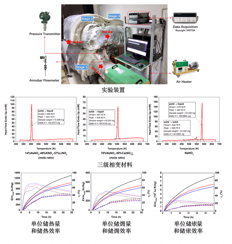 梯级相变储热可以存储多品位热能与冷能,符合“量热度需、热尽其用,温度对口、梯级利用”的基本原则。然而,梯级相变储热的研究工作集中于理论分析和数值模拟,实验验证较少,尤其是中高温梯级相变储热实验。本研究搭建了中高温三级相变储热实验平台,测量了储热单元内部的温度变化,基于热力学定律和火积原理开展了单个单元及整个梯级储热装置的热力学分析,研究了储热单元级数、进口温度、流体流量等因素对梯级相变储热平台热力学性能的影响,验证了梯级相变储热在传热与储热方面的优势。本研究成果在合理的温度、流量、压力测试基础上成功实现了最高温度为450 ℃的热能三级存储,热存储效率、㶲存储效率和火积存储效率分别提升了23%、21%和24%。