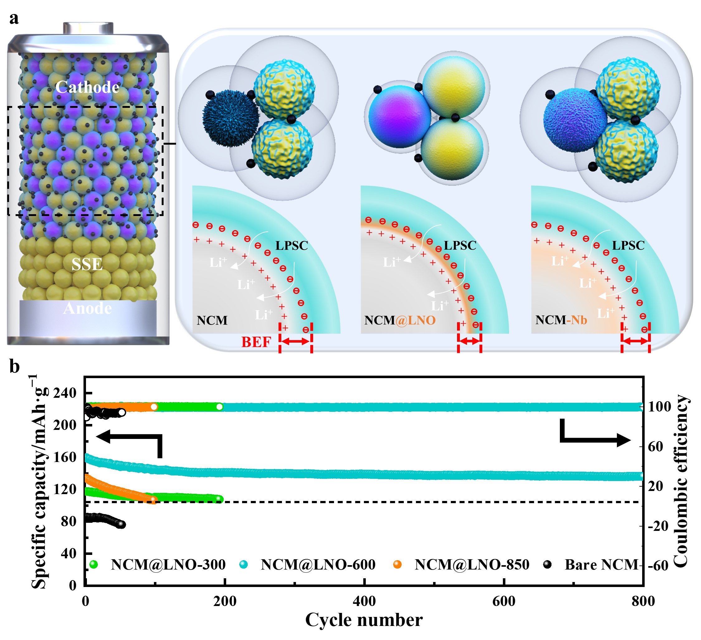 (a)铌酸锂界面层构筑可控正极侧空间电荷层机理示意图。(b)基于不同热处理温度下铌酸锂包覆三元正极材料的全固态电池长循环性能对比图。