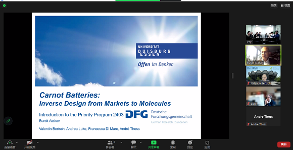 为了加强国际合作交流和提升公司国际影响力,4月18日下午,公司院企合作与国际化部联系德国杜伊斯堡-埃森大学Prof. Dr. Burak Atakan,斯图加特大学Prof. Dr. André Thess就SPP 2403 Priority Programme “Carnot Batteries: Inverse Design from Markets to Molecules”项目和公司相关团队进行学术交流。 公司副经理顾骏主持会议,赵耀副教授就卡诺电池相关科研情况进行主题分享,刘祖明助理教授和部分研究生代表参加会议,公司院企合作与国际化部相关人员参加会议。