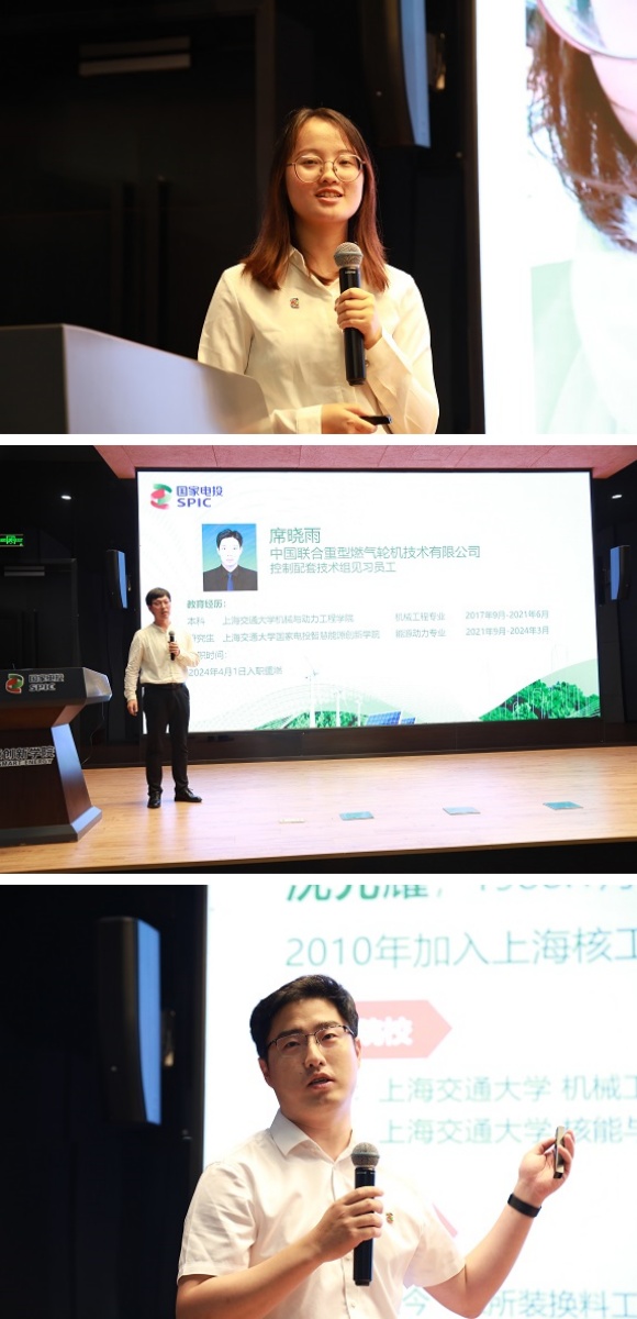 本次宣讲会还邀请了往届优秀员工进行分享,国核示范技术支持处王增玲和中国重燃实验验证中心席晓雨分别分享了校园生活以及就业经验;上海核工院装换料及非标设备室室主任沈光耀员工就国家电投的工作经历以及切身感受与同学们分享。